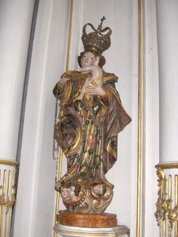Figura feminina, em vulto pleno, de pé em posição frontal e em contraposto, com menino. Sobre a cabeça, inclinada para a esquerda, destaca-se uma coroa de grandes dimensões. Com o braço direito segura um rosário, e com o braço esquerdo, coberto pelo manto, segura e ecosta ao peito o menino, nú, que a abraça. A imagem assenta sobre uma nuvem, apresentando na frente quatro rostos de anjo. Quanto aos panejamentos, a túnica cai ao longo do corpo com pregas em leque no fundo, enquanto o manto esvoaça em redor da imagem, ambos decorados com temas florais de rica paleta cromática.