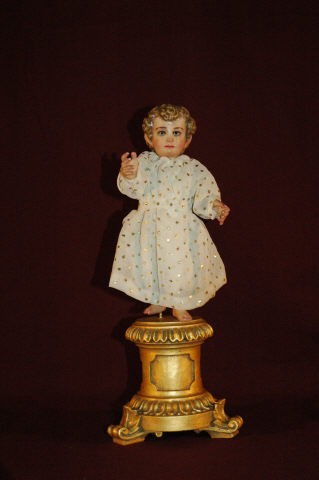 Figura masculina de aspecto muito jovem, de cabelos loiros representada em pé de posição frontal com olhar direccionado em frente no cimo de base circular assente em três pés em talha dourada. Apresenta-se com a mão direita ligeiramente levantada ao nível do peito e braço esquerdo em baixo. Usa vestes brancas ornamentadas por aplicação de lantejoulas.