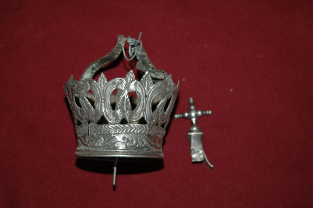 Coroa fechada com aro de moldura de escócia, seguida de registo sobre fundo floreado relevado emoldurada na parte superior por folhas de água. Corpo vazado com floreado recortado onde assentam três imperiais bastante danificadas convergindo em feixe no topo, decoradas por pontilhado relevado nos rebordos. Pináculo em forma de cruz partida. Tem espigão central.
