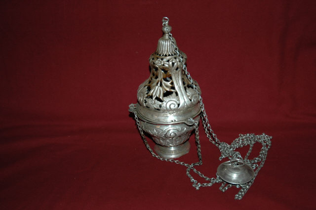 Turíbulo em forma de urna, com base circular alteada, de rebordo liso. Bojo do objecto apresenta-se com ressalto côncavo, com arranque em forma de campânula, com folheado relevado a ornamentar sobre fundo puncionado com volutas onduladas. Tem adossadas três argolas para passagem das correntes. Cúpula do objecto vazada de ressalto côncavo e com decoração assente em floreado diverso recortado com volutas ondeadas. Registo superior da cúpula em forma de campânula invertida, igualmente vazado com folhas de palma a ornamentar, rematado por pináculo em forma de urna com argola de suporte no topo. Correntes de suspensão com elos circulares, a convergir em guarda-mão em forma de disco circular, alteado ao centro de rebordo liso, somente com pequenos anéis incisos.