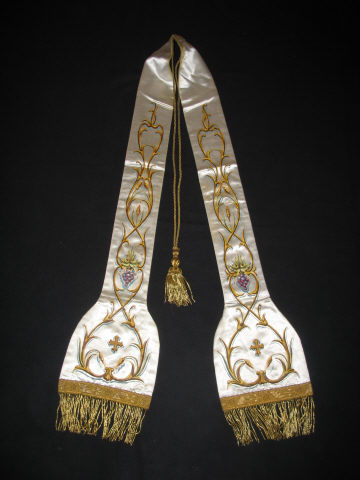 Estola em cetim branco, terminando em formas semi-circulares. O corpo é pintado a dourado, com motivos vegetalistas serpenteados, em desenvolvimento vertical, dos quais ramificam espigas. Na passagem para as extremidades apresenta um cacho de uvas, pintados a dourado e roxo. Nas extremidades uma cruz pintada a dourado. O desenho é delimitado por linhas azuis. O centro da peça apresenta uma cruz de galão dourado. Junto à baínha, a peça é rematada por galão de motivos eucarísticos, com franja de fio de metal dourado. Do centro sai um cordão com borla dourada.