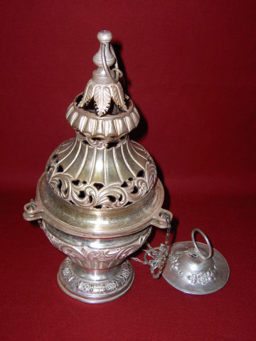 O turíbulo é rematado por um coruchéu liso com anel ornamentado por pequenas flores relevadas e incisas, com argola de suporte no topo.
