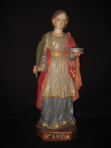Figura feminina, em vulto pleno, de pé em posição frontal. Rosto moldurado por longos e ondeantes cabelos castanhos, caíndo sobre as costas. O braço direito surge encostado ao corpo, com a mão voltada para fora, a qual segura uma folha de palma. Com o braço esquerdo, também encostado ao corpo, flectido, segura na mão um prato com dois olhos. Quanto aos panejamentos, é representada com túnica azul, sobrepujada por uma outra, mais curta e cintada, azul celeste, de orlas ornamentadas a dourado por motivos vegetalistas e fundo estriado. Sobre estas um manto, de interior rosa estriado e exterior vermelho, preenchido por pequenas estrelas e orlas com volutas vegetalistas. Este, lançado nas costas, prende sob os braços.