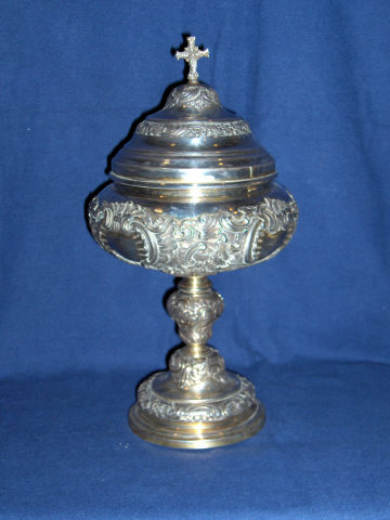 Píxide de base circular, com pé ornamentado por tarja de volutas vegetalistas. O arranque da haste e o nó, de forma periforme invertida, apresentam a mesma decoração. Copa bojuda, guarnecida por cartelas, envoltas em volutas acantiformes. Segue-se o bordo liso. A tampa, também com bordo liso, utiliza os mesmos motivos na decoração da tarja e do topo campaniforme. A peça é rematada por cruz latina.