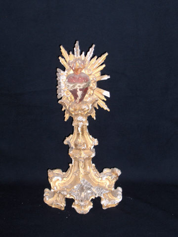 Peça de madeira entalhada em forma de tocheiro assente em quatro pés, dois dos quais em forma de voluta; pleno em segmentos ondulantes, côncavos e convexos, ornado com querubins nas laterais. Sobre isto, assenta um coração flamejante vermelho, envolto em nuvens e resplendor e com coroa de espinhos à sua volta.
