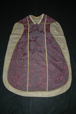 Casula de frente recortada e costas direitas, com decote em V e pilar em bico. Corpo de damasco roxo . Orlas e sebastos definidos por galão estreito de fio dourado.