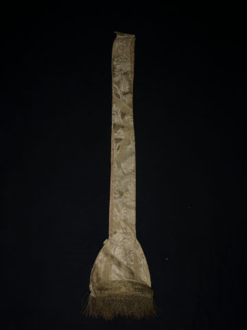 Estola de damasco branco lavrado a fios creme e dourado por motivos florais, com bases trapezoidais. No fecho apresenta uma cruz formada por galão de fio de metal dourado. Baínha debruada por galão mais largo, com franja.