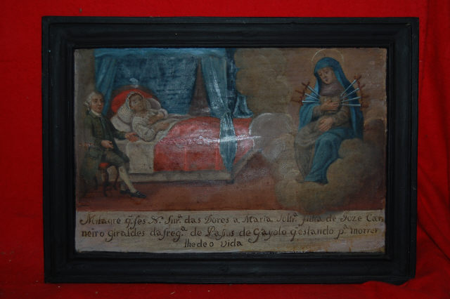 Pintura a óleo sobre madeira, de formato rectangular disposta na horizontal com a representação de três figuras humanas no interior de um quarto. Do lado direito, sentada sobre uma nuvem, uma figura feminina com a mão esquerda sobre o peito, que recebe igualmente sete punhais. Tem a cabeça ligeiramente virada para a direito e para baixo. Traja uma túnica castanha sobre a qual tem um manto azul. Tem uma aureola branca sobre a cabeça. Do lado esquerdo da representação uma está uma figura feminina deitada numa cama. A figura traja vestes e touca branca e coloca as mãos sobre o peito. A cama tem um dossel azul. Sentado junto á cama uma figura masculina, representado imberbe com cabelos brancos. Traja veste verdes.