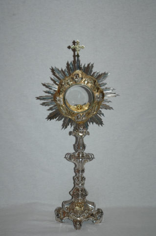 Ostensório de prata. Base quadrangular, assente em quatro pés decorados por volutas e motivos acantiformes. Recebe decoração em duas cartelas, envoltas por volutas e sobre um fundo de fino perlado, uma com a representação de um cordeiro sobre um livro e a outra com um pelicano. Haste balaustrada com um nó periforme invertido ladeado por duas aletas. Os anéis que envolvem a haste são decorados por pequenas flores de liz e por volutas. A haste é encimada por uma cabeça de criança alada. O hóstiario apresenta-se raiado e envolto por cercadura de curvados, espigas de trigo, cachos de uvas e querubins. Comporta ainda uma lúnula amovível, formada por um querubim.