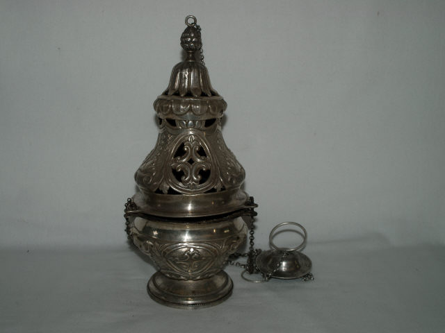 Turíbulo de prata em forma de urna. Base circular lisa, logo seguida de um registo côncavo definido por uma faixa de fino perlado. Caldeira com um registo inferior de folhas de acanto, seguido de um registo com três reservas ovais adornadas por uma flor estilizada de quatro pétalas. Reservas separadas por faixas adornadas por festões. Bordo superior da caldeira e aba inferior da chaminé têm soldadas três saliências circulares onde se fixam as argolas para suspensão das correntes. Chaminé repete decoração da caldeira mas com vazamentos. Pequena cúpula com corola, invertida de folhas de acanto, igualmente vazasa, encimada por um pequeno corucheu com forma de pinha com uma argola vazada. Guarda-mão circular, alteado ao centro e adornado por círculos incisos, com duas argolas, possui orifício central destinado à suspensão de correntes.
