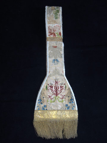 Manípulo de pontas trapezoidais em damasco branco lavrado com motivos vegetalistas policromos. Em tons rosa, roxo, verde, azul, dourado e prata, o padrão repete motivos florais e folhagens que se interligam e assumem diferentes formas e dimensões. Estreito galão dourado liga as duas bandas do manípulo e, a rematar a peça, um galão mais largo, franjado, lavrado com motivos eucarísticos: parras e uvas.