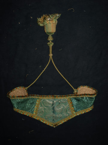Gola de formato triangular, de corpo de damasco verde e centro de tecido verde, lavrado a fio prateado por motivos florais e enrolamentos vegetalistas. Peça definida por galão franjado, tecido a fios verde e amarelo. Possui cordão rematado por borla, nos mesmos tons do galão. Forro de linho rosado.