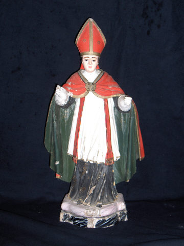 Figura de vulto masculina imberbe, representada em pé de olhar direccionado em frente com mitra vermelha ornamentada por motivos florais e remate dourado. Surge com os braços abertos, usa luvas brancas, alba branca e preta com pluvial vermelho e verde policromado com firmal e remate dourado sem ornamentação. Usa estola vermelha.