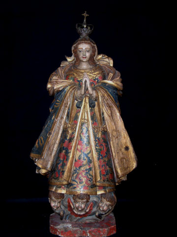 Figura feminina de vulto pleno com vestes e manto castanho, ambos estofados a ouro, floreados e com remate a dourado. Surge representada em pé em cima de uma nuvem com cabeças de anjo, e com as mão unidas ao peito e com coroa.