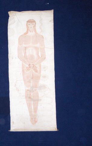 Na outra face, uma figura humana desnudada representada de costas. Com coroa de espinhos sobre cabelo comprido. Chagas ensanguentadas por todo o corpo.