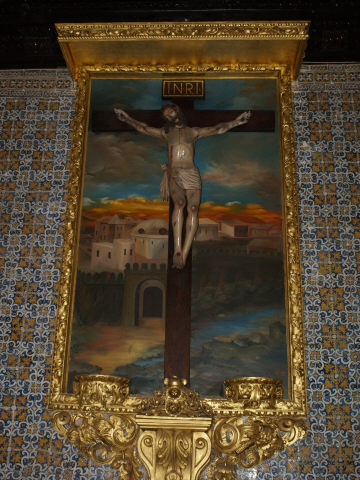 Imagem masculina de vulto pleno, adossada a uma cruz. Assume uma postura vertical e frontal, de braços erguidos e abertos, pregados, pelas mãos à cruz. A cabeça pende para o lado direito. Apresenta-se despido, com o corpo magro e massacrado ensanguentado por múltiplas feridas; a cobri-lo, um pano branco cingido à cinta. Os pés sobrepostos são igualmente pregados à cruz.