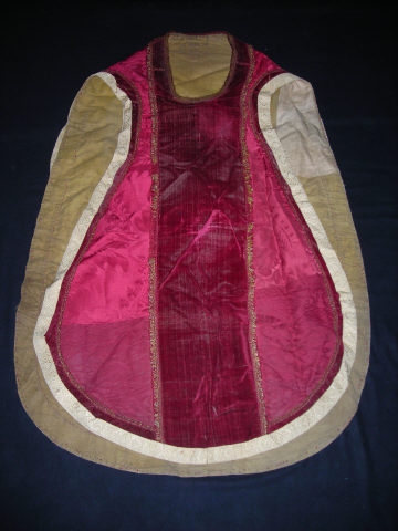 Casula com frente bastante recortada. Corpo da peça em damasco vermelho lavrado com largos motivos vegetalistas. Sebastos e tiras apresentam-se em veludo da mesma cor. Debrua as tiras, os sebastos e o decote um galão franjado em fio dourado e vermelho. Emoldura a peça outro galão, em seda creme decorado com losangos enquadrados por chavetas. Forro em fibra natural creme.