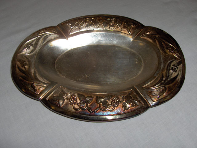 Prato de forma oval com rebordo quadrilobado e alteado. A decoração concentra-se aí, com orla segmentada em quatro campos por meio de molduras verticais; dois quadros com uvas e parras e outros dois com espigas posicionam-se alternadamente.