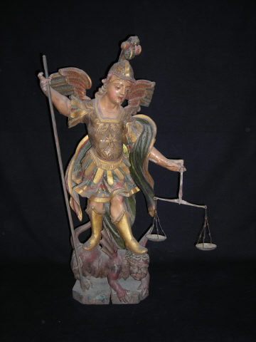 Imagem masculina de vulto pleno policromada. Figura alada apresenta-se de pé, numa posição frontal, embora ligeiramente voltada à esquerda. Ergue-se sobre um ser demoníaco vermelho, também alado, com rosto e tronco humanos e traseira de animal, com garras e cauda serpenteante.
