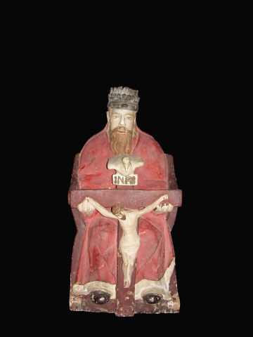Trio em pedra ançã composto por figura masculina de vulto pleno em destaque, representada sentada num trono de olhar direccionado em frente com barbas grandes castanhas e coroada. Surge com vestes vermelhas e brancas policromada. Segura com as duas mãos uma cruz latina policromada a castanho onde está crucificada uma figura masculina com sendal de cabeça pendida para o lado direito. No cimo da cruz está representada uma pomba branca por cima de uma placa igualmente branca com inscrição relevada.