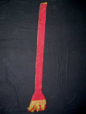 Estola em damasco vermelho com galão castanho esverdeado em brocatel, franjado em fio colorido, cruz ao centro em tecido vermelho e amarelo. Estrutura ornamental do tecido assente em ornamentação fitomórfica.