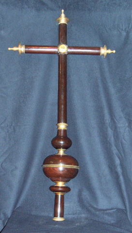 Cruz processional de haste e braços de secção cilindrica e nó com a forma de uma esfera achatada. A ligação entre o nó e a haste é assegurada por um anel. A haste prolonga-se por um espigão de encaixe. Os braços são de encaixe simples, em madeira torneada. As hastes são lisas, sem decoração e de secção tubular. As extremidades dos braços são rematadas por peças em latão torneado, de desenho circular, semelhantes a escócias e plintos de coluna, que terminam em remates fusiformes. Na intersecção dos braços (anverso e reverso) existe um elemento similar, também em latão torneado, que proporciona um reforço adicional ao conjunto.