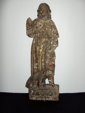 Figura masculina de vulto pleno, representada de pé de olhar direccionado em frente com barba e cabelos longos castanhos. Surge com vestes castanhas compridas estofadas a ouro. Usa botas pretas, tem o braço direito ligeiramente levantado à altura do peito e braço esquerdo em baixo com que levanta ligeiramente as suas vestes para mostrar uma ferida que tem na sua perna esquerda. Tem aos seus pés um cão escuro sentado com um objecto na sua boca.