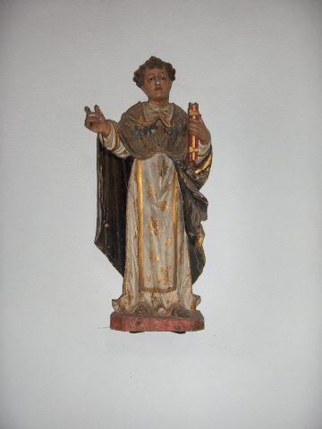 Escultura masculina polícroma, de vulto pleno, representada de pé. A figura é a de um homem ainda jovem, escanhoado, envergando vestes eclesiásticas. Numa das mãos segura um livro, enquanto que a outra se ergue em aparente atitude de pregação. A indumentária inclui um grande manto com capuz e um longa túnica branca que chega ao solo, quase cobrindo os pés. A decoração empregue é de tipo fitomórfico, sendo mais densa na superfície exterior do manto.