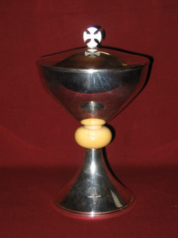 Píxide de base circular lisa, ornada por uma cruz. Apresenta haste tronconiforme, com nó circular em marfim. Copa lisa de interior dourado. Tampa ligeiramente curvada para o exterior, rematada por cruz de extremidades curvas.