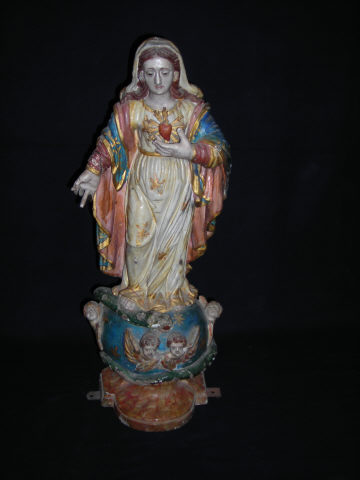 Um globo azul estrelado acompanhado por querubins e em torno do qual se dispõe uma serpente verde, servirá de base para a colocação de uma imagem feminina de vulto pleno policromada. Figura de pé, de numa posição frontal e olhar baixo. O braço direito estende-se e a palma da mão abre e direcciona-se para o chão; já o braço esquerdo flecte sobre o peito e a mão toca o pequeno coração vermelho resplendorado. Veste túnica creme ornada com motivos vegetalistas e galões dourados; a colocação do cinto dourado provoca um franzir do tecido no ventre. A adulta pisa a serpente com o pé direito, o que implica uma ligeira flexão da respectiva perna; esta postura provoca uma concentração dos pregueados na zona entre pernas. Cobre-a ainda um manto azul lavrado com vegetalismos dourados e com forro vermelho; prende, à frente, nos braços, e desce em linhas ondulantes pelas costas.