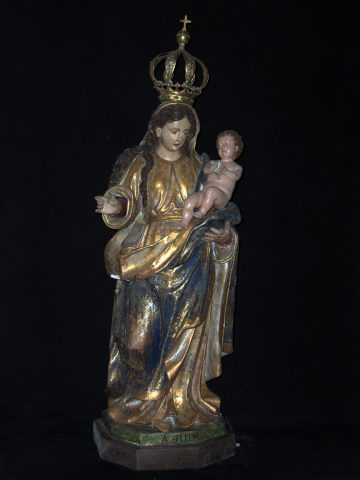 Figura feminina, media dimensão, vulto pleno, representada de pé. Com braço direito ligeiramente afastado do corpo, segura sobre o braço esquerdo um menino nu. Rosto ligeiramente inclinado para a esquerda e para baixo, olha em direcção do menino.
