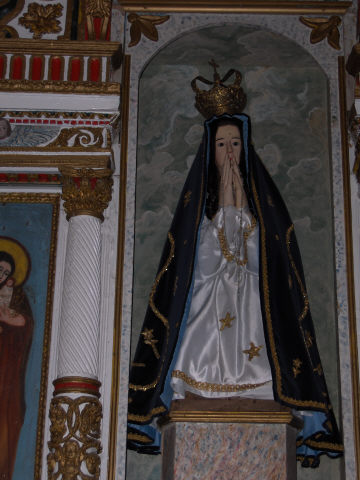 Figura feminina, média dimensão, de vestir, representada de pé em posição frontal. Tem apenas o rosto, pescoço e as mãos bem definidas, sendo o resto do corpo em madeira maciça não trabalhada. Tem as mãos postas sobre o peito. Cabeleira postiça sobre a qual tem um manto de veludo roxo debruado por um galão rendado de fio de metal dourado e decorado com o mesmo galão e por pequenas flores douradas. Vestido branco, que lhe cai até aos pés, debruado por galão rendado de fio de metal dourado e adornado por pequenas estrelas.