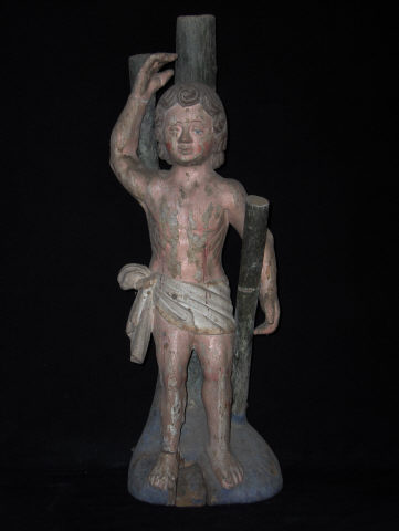 Figura masculina de vulto pleno, de pequena dimensão, preso ao tronco de uma árvore. Representado em posição frontal, com o braço direito bem levantado colado ao tronco da arvore. Imberbe, cabelos curtos de cor castanha e olhos bem azuis. Sendal branco envolve-lhe a cintura. Chagas ensanguentadas no corpo. Tronco da árvore divide-se em vários ramos.