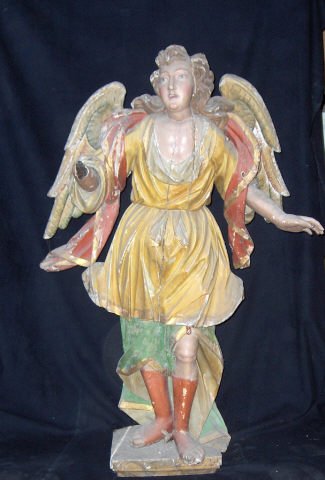 Imagem masculina alada, de vulto pleno e policromada. Figura de pé, numa posição frontal, com a cabeça inclinada à direita e olhar voltado na mesma direcção. Assume uma postura dinâmica ao destacar os braços do tronco da peça e explorar os gestos. O braço direito ergue-se até ao nível do peito; já o esquerdo mantém-se descido, afasta-se do tronco e, numa postura delicada, apresenta a palma da mão aberta e voltada para baixo.