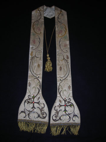 Estola paroquial de cetim branco bordado a fio de metal dourado e prateado, criando decoração de motivos vegetalistas e geometrizantes complementarizados pela presença de pedraria de vidro multicor, lantejoulas diversas e fio dourado. As bases possuem duas cruzes, igualmente, bordaddas e rematam com franja dourada, torcida.