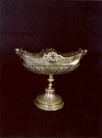 Naveta com base ornada por um friso geométrico, sobe em estrias largas e espaçadas e termina em folhas. O pé torneado e a caixa de incenso é decorada com folhas na parte inferior, colocadas em posição radial e na parte superior apresenta um friso de sucessivas formas arredondadas. Com um furo ao centro. As extremidades têm duas cabeças de anjos. A tampa está decorada com elementos vegetais sobre fundo martelado.