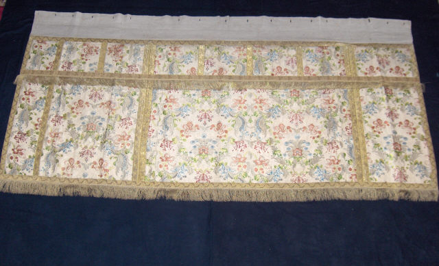 Frontal de altar em damasco branco lavrado com motivos vegetalistas policromos. Em tons rosa, roxo, verde, azul, dourado e prata, o padrão repete motivos florais e folhagens que se interligam e assumem diferentes formas e dimensões.