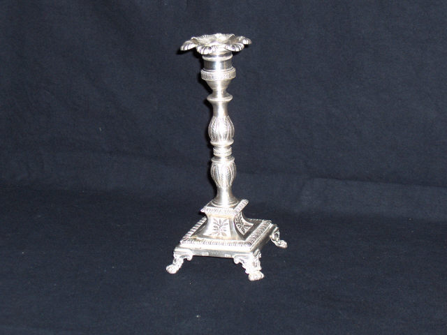 Castiçal em prata com base assente em quatro pés em forma de garra. Base quadrangular alteada moldurada, ornamentada com motivos lanceolados que se repetem. O arranque da base recebe, em cada um dos lados, um rectângulo onde se insere folhagem. Novamente uma moldura de motivos lanceolados. A haste balaustrada recebe decoração com folhagens e anéis pontilhados e estriados. A rematar, a copa do castiçal assume a forma de flor, com pétalas estriadas.