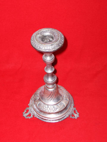 Castiçal em prata com base circular assente em três pés com decoração fitomórfica recortada. Arranque da haste em forma de campânula puncionado num primeiro registo, seguido por uma faixa lisa convexa e por uma faixa com decoração fitomórfica relevada encimada por uma larga faixa decorado por pequenos sulcos. a. Haste balaustriforme com anéis simples. Bocal cilíndrico com estrangulamento central decorado por pequenas folhas incisas. Arandela com decoração foliácea incisa com bocal circular.