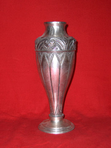 Jarra em prata de corpo abalaustrado com base circular. Base alteada por três registos lisos. Bojo estreito, decorado inferiormente por pequenas folhas inseridas em triângulos. Na parte superior recebe enrolados e concheados relevados. Bocal circular.