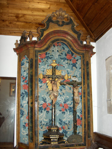 Oratório de formato paralelipipédico, ao alto, de madeira e com porta e janelas envidraçadas. É encimada por remate triangular, entalhado, decorado por concheado estilizado. A face interior é revestida por pintura de motivos florais onde predomina o azul. As extremidades da peça estão pintadas de verde e vermelho que dão contraste à cor da madeira.