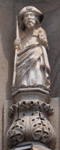 Imagem de exterior sem policromia em pedra ançã, que representa figura masculina de vulto, em pé com vestes compridas e chapéu com concha na parte frontal a ornamentar. Surge com manto entrelaçado no corpo e tem livro fechado na mão esquerda e espécie de cajado na mão direita.