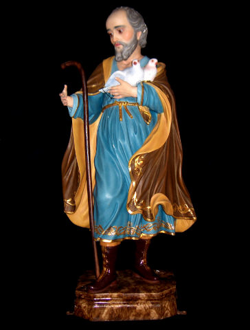 Figura masculina de madeira policromada, trabalhada a vulto pleno, em posição frontal. Tem a perna direita ligeiramente avançada e flectida, usa vestes azuis cingidas à cintura por laço dourado, com manto pelos ombros em tons de castanho. Surge representado com feições envelhecidas, cabelos e barbas grisalhas. O seu braço direito está ao nível da cintura, ostenta uma bengala, do lado oposto à altura do peito um conjunto de duas pombas brancas.