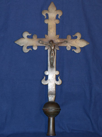 Cruz processional com extremidades flordelisadas, tendo as faces desprovidas de decoração. A área de intersecção da haste com os braços desenvolve-se num quadrado, de lados côncavos e sobre o qual apresenta-se uma figura crucificada, tipo agonizante. A cruz assenta numa haste cilíndrica, encimada por nó esférico achatado e com friso que corre todo o seu perímetro.