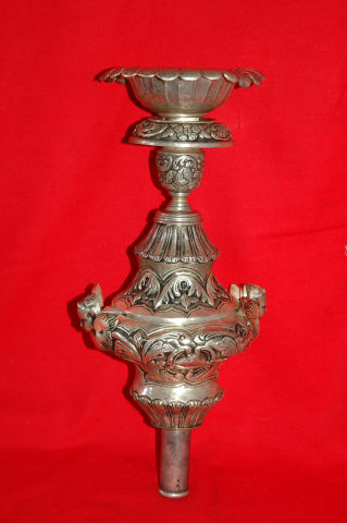 Tocheiro de prata com haste de secção cilíndrica, de pega simples com encaixe para vara de secção circular emoldurada por anel na parte inferior, sendo a parte inferior do objecto representado em forma de campânula e ornamentado por pétalas relevadas. Bojo do objecto apresenta-se com ressalto contra curvado de fundo puncionado e adornado por densa folhagem e volutas que inscrevem cartelas nas faces, terminando igualmente em forma de campânula invertida de decoração semelhante. Destacam-se querubins de vulto adossados à estrutura na parte lateral. Arandela de formato circular, com rebordo de perfil convexo antecedida por tambor cilíndrico floreado. Bocal cilíndrico, suportado por campânula. Tem marcas visíveis.