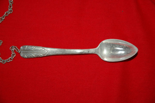 Colher lisa com concha de mergulho ovalada. Cabo espatulado de extremidade decorada por folhagem. Tem marcas visíveis.