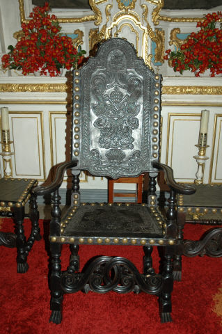 Cadeira com estrutura de madeira, tem assento e costas de couro lavrado, ornamentado por elementos florais emoldurados por grinaldas, fixado por pregaria dourada de latão; Assenta em quatro pernas balaustriformes com pés gomados, as pernas dianteiras são torneadas unidas com as posteriores por travessas abalaustradas com prismas; Tem aba recortada por volutas, os braços curvos, recuados e enrolados nas extremidades; Espaldar rectangular igualmente fixo por perlado dourado com motivos iconográficos ao centro, de recorte polilobado nas extremidades, o superior com pináculos a ornamentar.