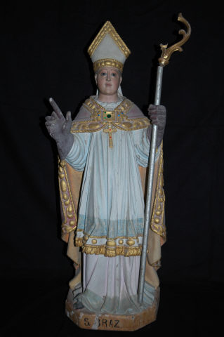Figura masculina de médias dimensões em madeira policromada trabalhada a vulto pleno, representada de pé e frontal sobre base quadrangular marmoreada de cantos chanfrados legendada na parte frontal. Apresenta-se de rosto imberbe e bojudo, ligeiramente alongado de queixo proeminente, de feições jovens, com olhar direccionado em frente. O corpo assume posição hierática, surge com o braço direito levantado à altura do peito, com a mão em sinal de bênção e no lado oposto abre levemente o braço e ostenta báculo de crossa dourada. Enverga mitra pérola agaloada por godrões dourados tendo na parte traseira dois pendentes de mitra. Usa batina rosada, com alba branca com rendilhado estilizado e debruada por galão franjado, com pluvial roxo igualmente debruado por godrões relevados a dourado, preso ao peito por firmal e adornado por pedraria policroma. Tem cruz peitoral igualmente dourada. Calça sapatos pretos e luvas roxas.