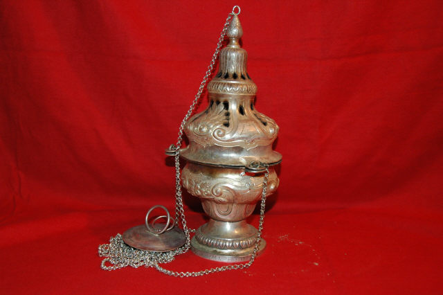 Turíbulo em forma de urna, de base circular emoldurada de orla lisa com inscrições incisas, sobrepujada por tarja de folhagem, com registo central alteado. Bojo do objecto apresenta-se com ressalto côncavo liso com arranque em forma de campânula bojuda, lavrada por folheado e volutas sobre fundo puncionado. Cúpula do objecto vazada de ressalto estrangulado e com decoração semelhante à parte inferior, com registo superior em forma de campânula invertida igualmente vazado com cercadura de folhagem, rematado por pináculo em forma de pinha, com argola de suporte no topo. Correntes de suspensão com elos circulares, a convergir em guarda-mão em forma de disco circular, alteado ao centro com folhagem incisa a ornamentar.