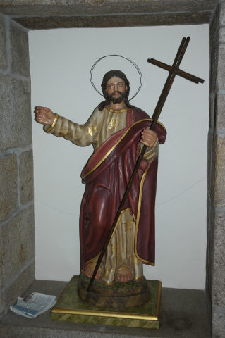 Figura masculina, de tamanho natural em madeira policromada trabalhada a vulto pleno, representada de pé em posição frontal sobre base circular de perfil marmoreado. Tem perna direita ligeiramente flectida, o olhar está direccionado em frente. A imagem apresenta cabelos e barbas bífidas e fartas com razoável tratamento estilístico de cor castanha. O braço esquerdo flectido ao nível da cintura junto ao quadril, ostenta uma cruz. O braço direito, abre-se à altura do peito. Usa vestes pérolas floreadas a dourado com manto vermelho lançado sobre o ombro esquerdo em trespasse junto ao peito apanhado pelo braço esquerdo.